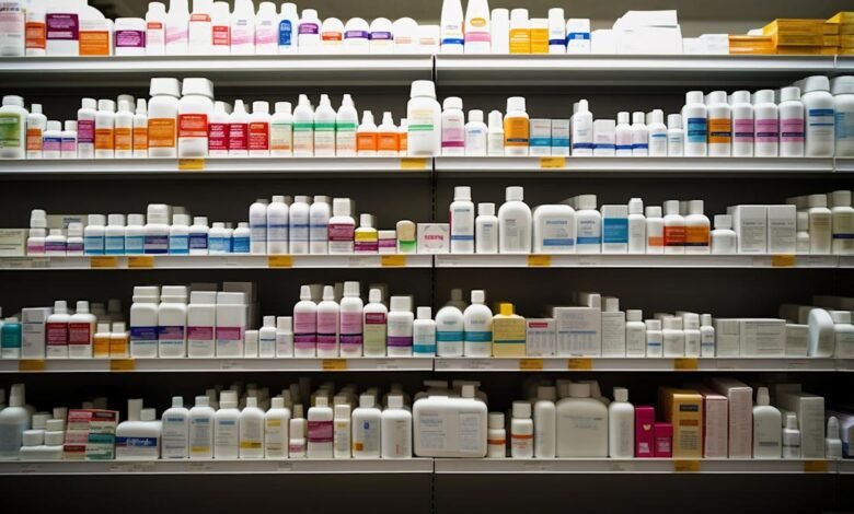 A pharmacy shelves stocked with pharmaceutical drugs awaiting distribution.