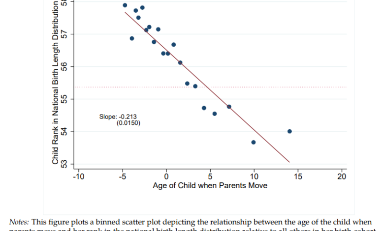 * I have simplified slightly for intuition. Technically, Eshaghnia shows that children’s birth‑length ranks align with the destination–origin permanent‑resident birth‑length difference, and that alignment is ≈0.044 stronger for each year earlier the move.