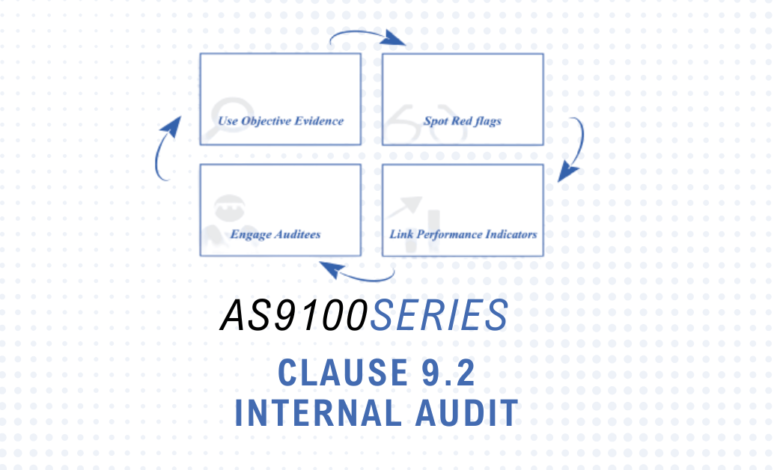 AS9100 clause 9.2 internal audit cycle showing four steps: use objective evidence, spot red flags, link performance indicators, and engage auditees