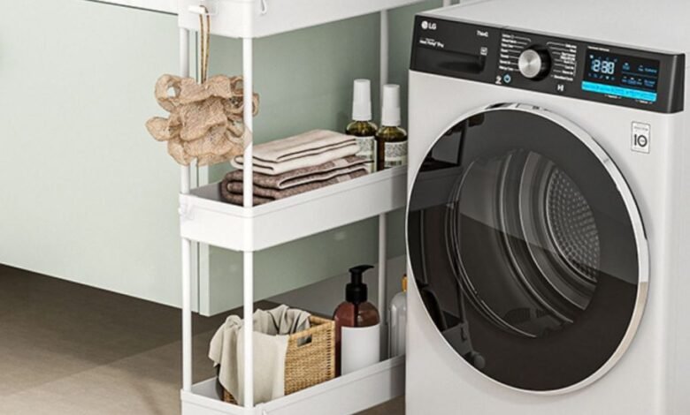 on top of the dryer anymore. While it is too thin for our Costco-sized detergent pods, I think I will buy a thinner container to transfer them into and place on the top shelf. The wheels make it extra easy to grab something from the back of a shelf and slide it right back in. Highly recommend for a uniquely small space!
