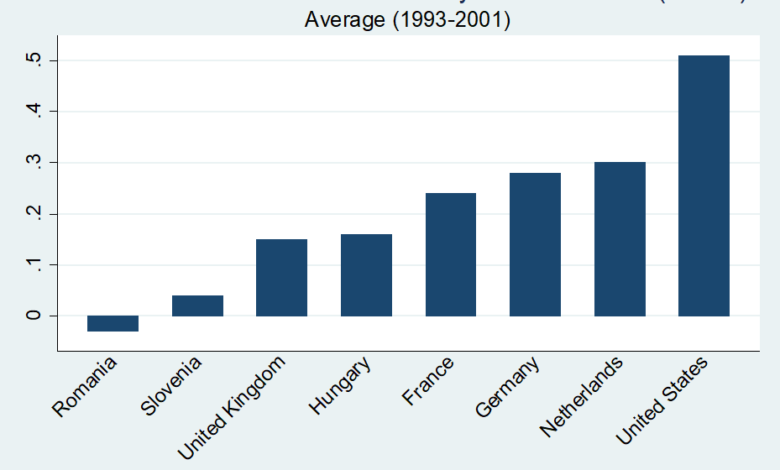 Thus, Aghion and Howitt’s model lends itself to micro-data on firm entry and exit of the kind pioneered by Haltiwanger and others (who Tyler and I have argued for a future Nobel). Economic growth is not just about new ideas but about how well an economy can reallocate production to the firms using the new ideas. Consider the picture below, based on data from Bartelsman, Haltiwanger, and Scarpetta. It shows the covariance of labor productivity and firm size. In the United States highly productive firms tend to be big but this is much less true in other economies. In the UK during this period (1993-2001) the covariance of productive and big is considerably less than half the rate in the United States. In Romania at this time the covariance was even negative–indicating that the big firms were among the least productive. Why? Well in Romania this as the end of the communist era when big, unproductive government run behemoths dominated the economy. As Romania moved towards markets the covariance between labor productivity and firm size increased. That is the economy became more productive as it reallocated labor from low productivity firms to high productivity firms.
