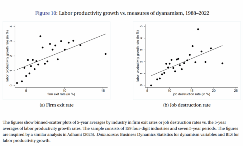 A good figure from the Nobel Prize Foundation’s Scientific Background to the Mokyr, Aghion and Howitt Nobel. The figure shows that firm exit rates and job destruction rates are positively correlated with growth in labor productivity; creative destruction in a nutshell.