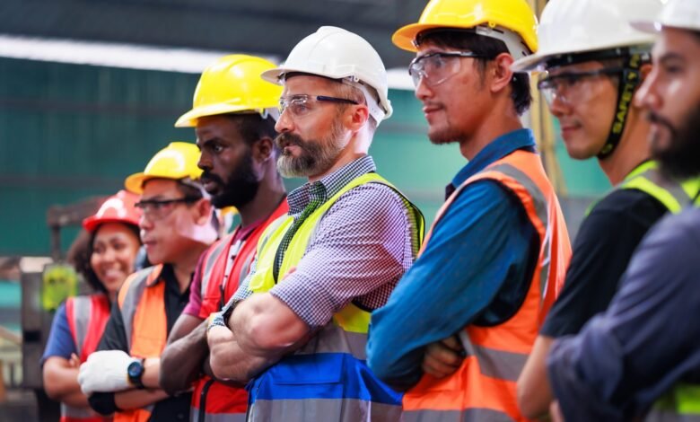 Team of workers in a factory or warehouse wearing safety vests, hard hats, safety glasses.