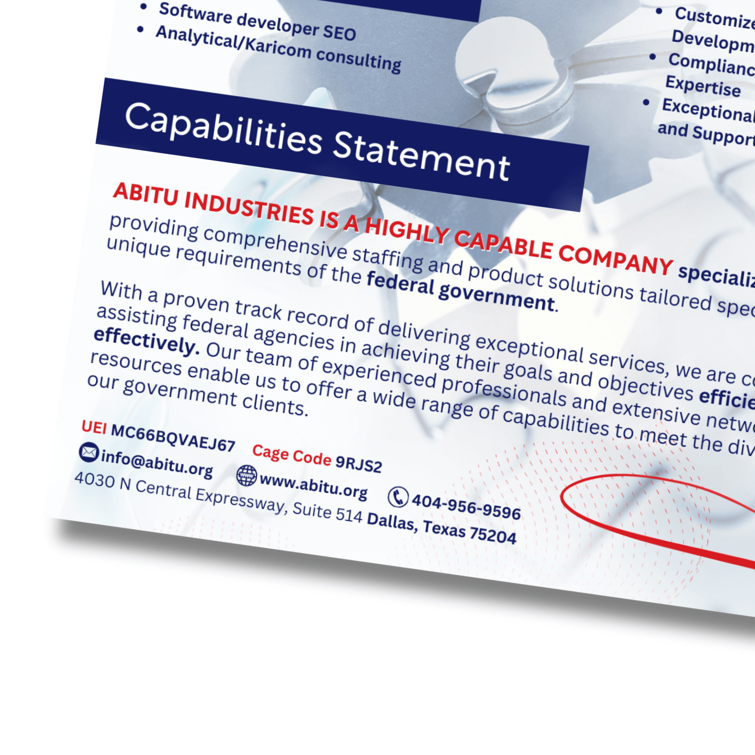 Ready to upgrade your capability statement? Our team specializes in capability statement design for contractors, small businesses, and federal suppliers. Let’s create a document that helps you stand out — and win.