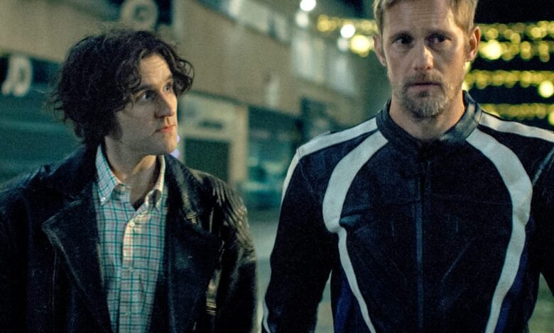 Although based on the 2020 novel ‘Box Hill’ by Adam Mars-Jones, Harry Lighton’s Pillion is mostly unrecognisable from its source material, retaining only a few crucial details. Gone is the 1970s Surrey setting, along with the first-person narration and reckoning with queer identity at the height of the AIDS crisis. Kept are the names – Colin and Ray – and the latter’s ties to the local BDSM biker community, but where Mars-Jones’ novel skewed heartbreaking, this loose adaptation is broadly buoyant, as the mild-mannered traffic warden Colin (Harry Melling) finds himself entangled in a dominant/submissive relationship with the near monosyllabic Ray (Alexander Skarsgård), a gorgeous unknowable alien who seems to get exactly what he wants every second of every day without having to ask for it. And as unlikely as it seems when they first meet – one performing with his barbershop quartet in a pub, the other in his biker leathers, not looking up from a stack of Christmas cards he’s filling out – Ray wants Colin.