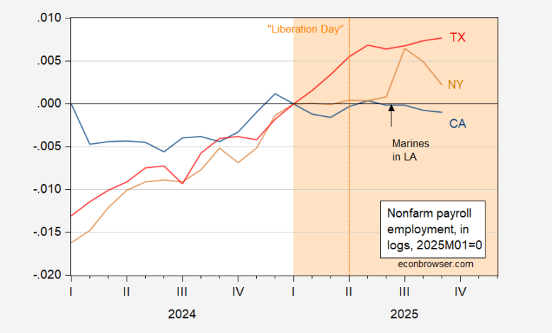 Figure 1: Nonfarm payroll employment in CA (blue), NY (tan), and TX (red), all s.a., in logs, 2025M01=0. Source: BLS, and author’s calculations.