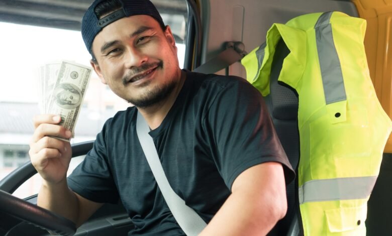 Happy truck driver smiling with money