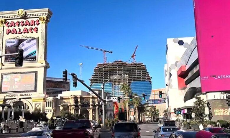 Caesars followed with a smaller pylon at Caesars Palace (85 feet tall overall, with an LED display exceeding 6,000 square feet). Under construction since late 2025, it’s scheduled for a mid-2026 launch — also via Branded Cities.