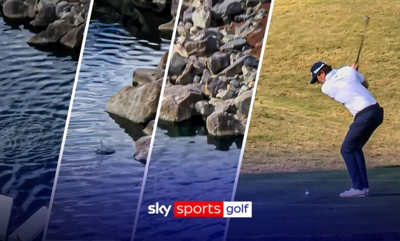 Nico Echavarria goes into the water three times on the par three 17th hole at the American Express. He finished the hole with a nine. Source link