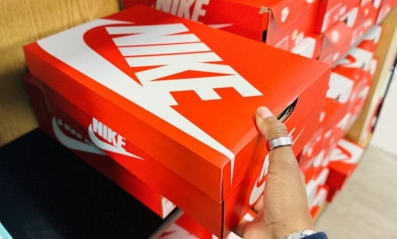 person's hand pulling an orange and white Nike shoe box off a store shelf with more Nike shoes and boxes around it
