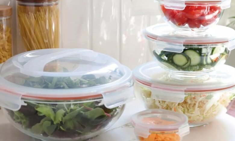 A variety of food storage containers are shown: stackable plastic with blue lids, nested stainless steel mixing bowls, and glass bowls with green lids.