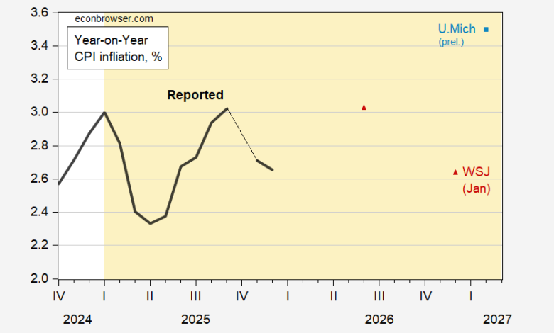Figure 1: Year-on-Year CPI inflation (bold black), U.Michigan February survey mean (prel.) (light blue square), WSJ January survey mean (red triangle), all in %. Source: BLS, U.Michigan, WSJ, and author’s calculations.