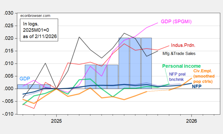 Figure 1: Implied NFP preliminary benchmark revision (thin blue), post-benchmark NFP (bold blue), civilian employment with smoothed population controls (bold orange), industrial production (red), personal income excluding current transfers in Ch.2017$ (bold light green), manufacturing and trade sales in Ch.2017$ (black), and monthly GDP in Ch.2017$ (pink),GDP (blue bars), all log normalized to 2025M01=0. Source: BLS via FRED, BLS, Federal Reserve, BEA 2025Q3 revised release,S&P Global Market Insights (nee Macroeconomic Advisers, IHS Markit) (1/2/2025 release), and author’s calculations.