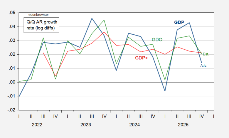 Figure 1: GDP advance (bold blue), GDP+ (red), GDO estimate (green), all Q/Q annualized growth rate, calculated as log first differences. GDO calculated based on estimated net operating surplus for 2025Q4, forecasted using first differences regression on constant, 2021Q1-25Q3. Source: BEA, Philadelphia Fed, and author’s calculations.