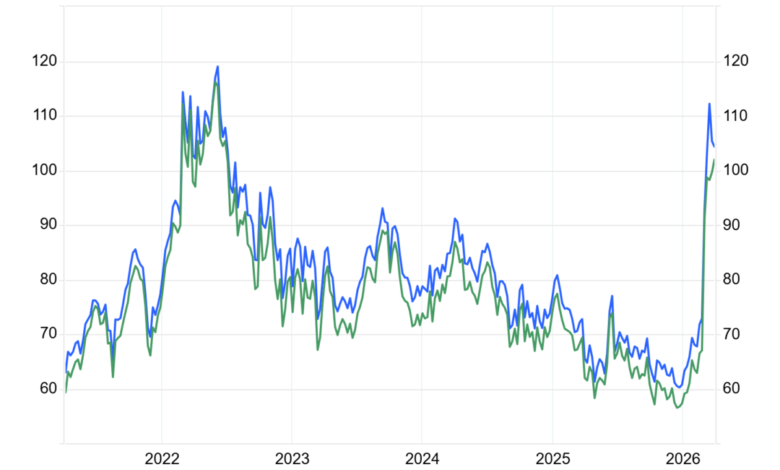 Notes: Brent (blue), WTI (green).