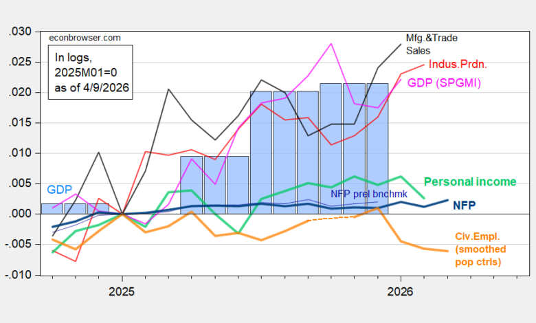Figure 1: Nonfarm payroll (NFP) employment preliminary benchmark revision (thin blue), NFP employment (bold blue), civilian employment with smoothed population controls (bold orange), industrial production (red), personal income excluding current transfers in Ch.2017$ (bold light green), manufacturing and trade sales in Ch.2017$ (black), and monthly GDP in Ch.2017$ (pink),GDP (blue bars),  all log normalized to 2025M01=0. Source: BLS via FRED, BLS, Federal Reserve, BEA 2025Q4 3rd release, S&P Global Market Insights (nee Macroeconomic Advisers, IHS Markit) (3/23/2026 release), and author’s calculations.