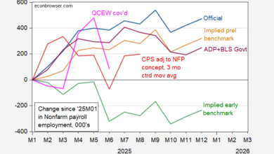 From CES, CPS, QCEW, Philly Fed, and from ADP: Figure 1: Cumulative change in nonfarm payroll employment from BLS CES-official…